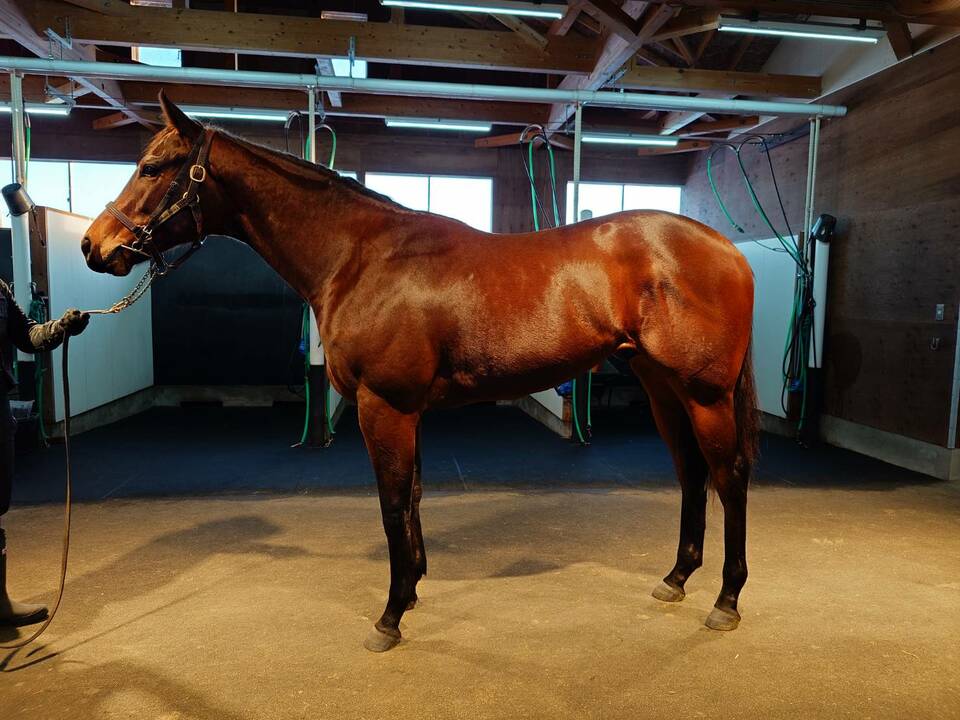 ノーザンファーム空港在厩。現在週3日は屋内坂路コース(900m)2本、ハロン16~17秒のキャンターを消化し、年末年始のリフレッシュ前にはハロン15秒で登坂するなど、この時期の明け2歳馬としては順調に進んでいます。残りの日は周回コースで2500mのハッキングキャンターと長めの距離を乗ることで基礎体力も備わってきて、日々成長著しい1頭です。調教ペースを進めると少しカイバ食いが細くなりますが、疲労を考慮して時折休養を挟む事で、現在の馬体重も509kgと以前と変わらない状態を維持出来ています。ストライドの広い走りからはパワータイプの印象ですが、芝・ダートどちらでも力が発揮できる素質を兼ね備えているとの評価を受けています。とのコメント。